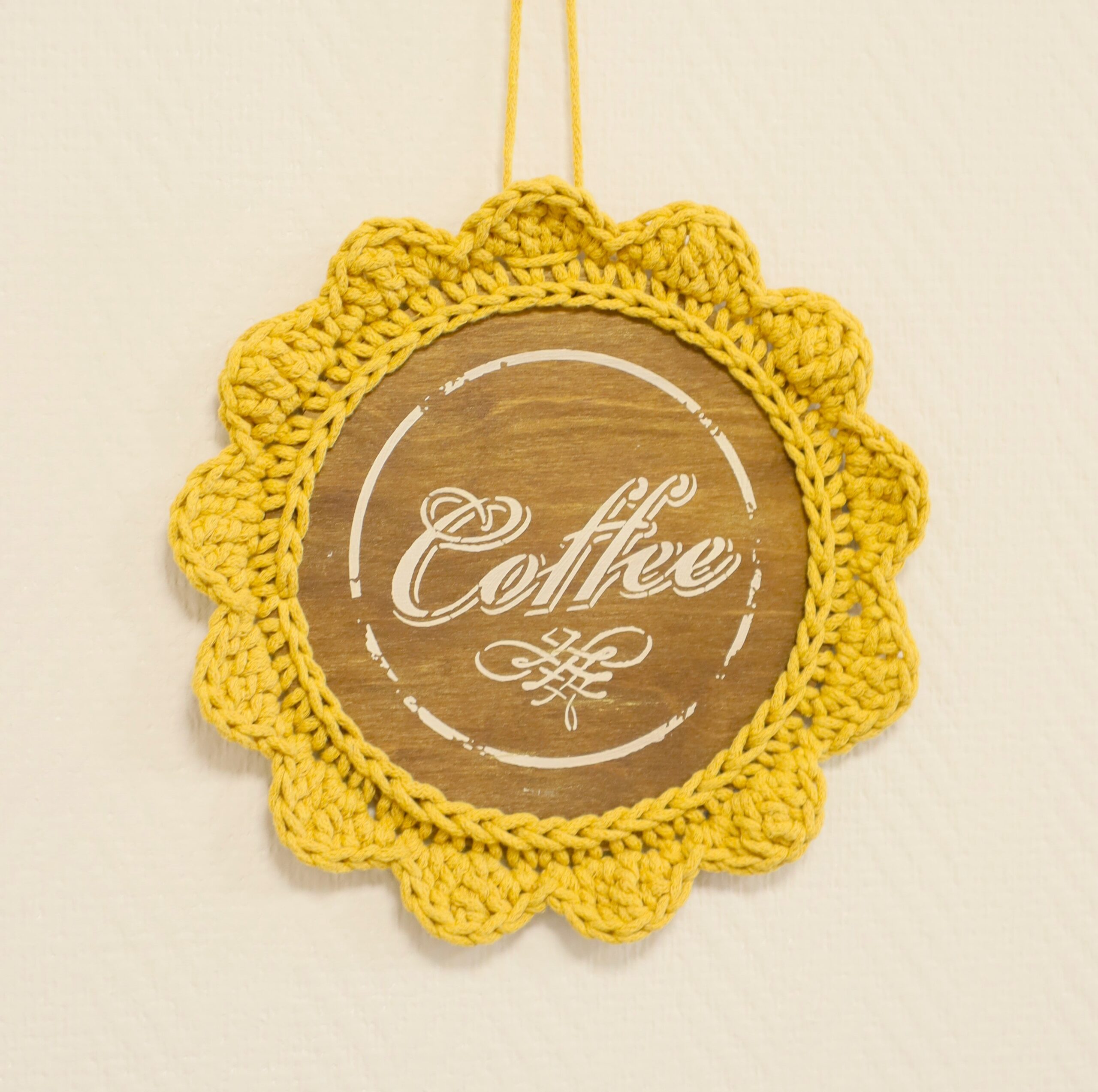Sárga horgolt falidísz kávés felirattal, 20 cm átmérőjű, pácolt alapon. Egyedi megrendelés előzetes egyeztetés alapján.